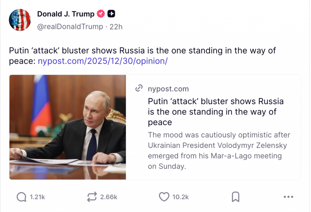 Le président Trump avait dans un premier temps pris parti pour la version russe avant de minimiser les allégations du Kremlin concernant une potentielle tentative d’assassinat du président russe, en publiant un lien vers un éditorial du New York Post contestant la réalité de cette attaque et affirmant que cette fausse information « montre que la Russie est celle qui fait obstacle à la paix ».
